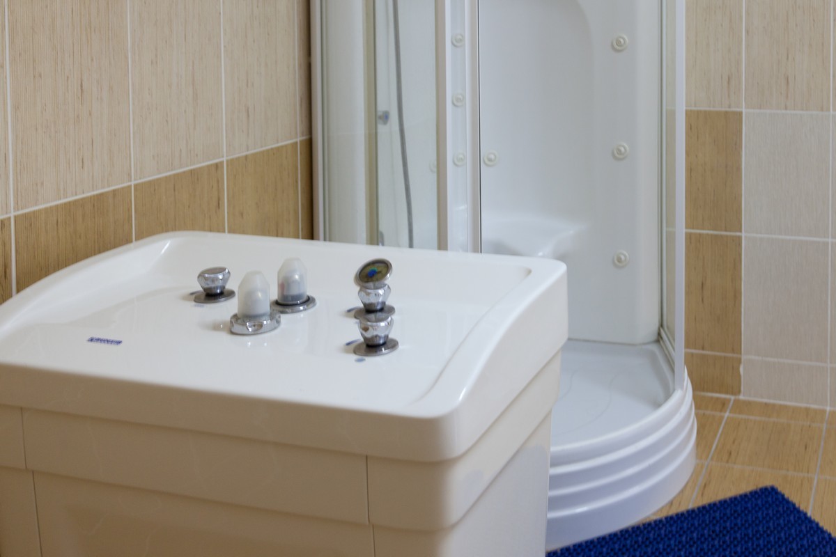 Ванная с душевой кабиной в каждом блоке на два номера. В прихожей блока можно найти холодильник, вешалку для верхней одежды и полку для обуви.